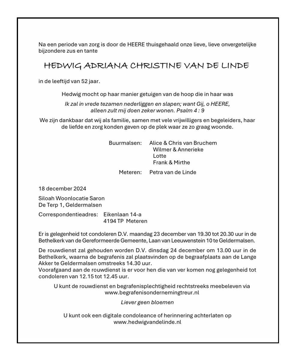 Heb een paar keer met Hedwig op de Linge oever gewerkt( stond vast op een andere groep) maar wat missen jullie een lieve (schoon) zus en tante. Van harte gecondoleerd met dit verlies. Wat een troost dat ze heeft mogen getuigen en dat ze nu mag zingen voor Gods troon. De Heere zelf ondersteune jullie met Zijn kracht en nabijheid in dit grote verlies. Wat hebben jullie ze ook met veel liefde mogen omringen….de Heere zij jullie nabij